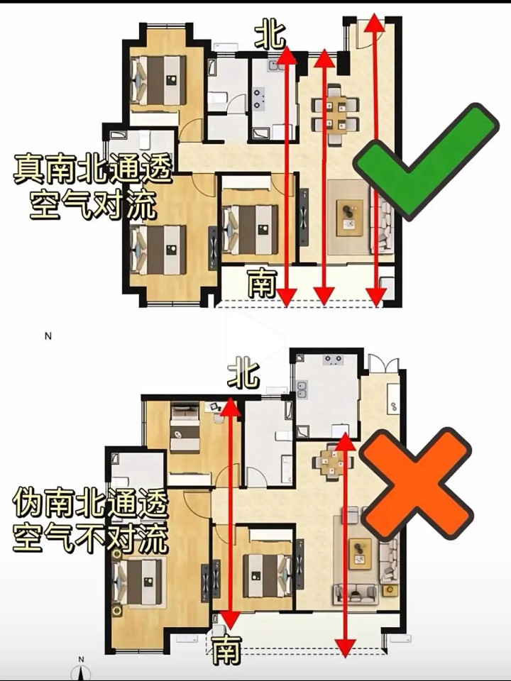 真正的南北通透是指客厅、餐厅或卧室是一条直线,窗户南北相对通风,形成空气对流,家里一点都不憋闷。