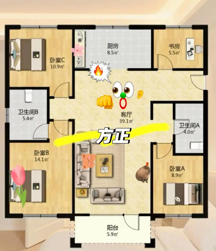 方方正正的户型,是“黄金户型”的基础。它不光看着顺眼,实际住起来也舒服。