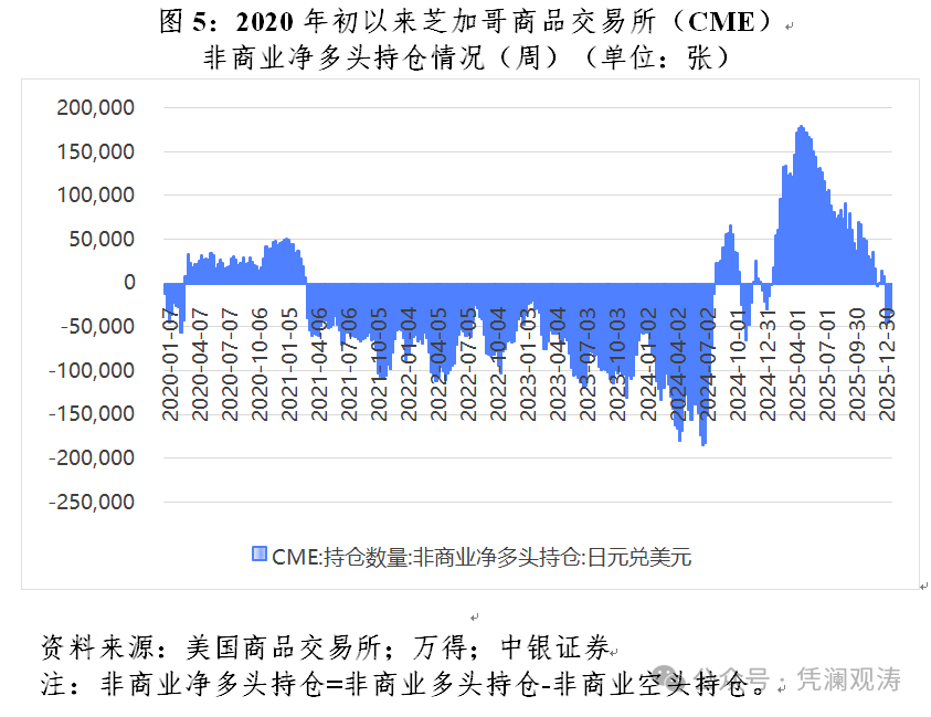 日美利差与日元汇率关系的“逆转”是日本经济深层次结构问题、财政刺激预期,以及市场提前消化加息预期等多因素共振的结果。如果日本央行加息幅度与节奏不到位,则难以扭转日元颓势。而日元持续贬值反过来又将推升加息压力:其一,贬值推高进口成本,加大日本输入性通胀压力,日本央行为稳通胀不得不加息;其二,尽管日美利差收窄,但利差绝对水平仍可覆盖套息交易成本,叠加日本政府债务负担加重削弱日元资产吸引力,资金持续外流,日本央行为稳汇率不得不加息。美国商品期货交易委员会数据显示,日元对美元非商业净多头持仓规模自2025年5月以来持续回落,到2026年1月底重新跌回净空头区间,反映了投机资金再次转向看空日元(见图5)。