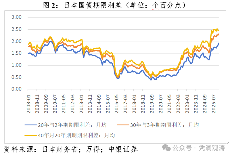 “高市冲击”的直接原因是本次公布的减税计划动摇了市场对日本财政可持续性及财政纪律的信心。与短端国债收益率着重反映货币政策松紧预期不同,长期国债收益率侧重对通胀预期和财政风险的定价。新冠疫情以来,日本大规模财政刺激的出台推动国债期限利差(以长期限国债收益率扣减2年期国债收益率计算)步入上行通道,2025年以来期限利差变得更加陡峭。到2026年1月,月均20年、30年和40年期与2年期日债收益率差分别较2024年12月上升了0.64、0.66和0.48个百分点(见图2)。此次高市早苗宣布的消费税减免被限定为两年,但市场预估每年仍将造成约5万亿日元税收损失。高市政府对于如何弥补相应财政收支缺口语焉不详,本次减税究竟是“暂时”还是“永久”,亦存在不确定性。