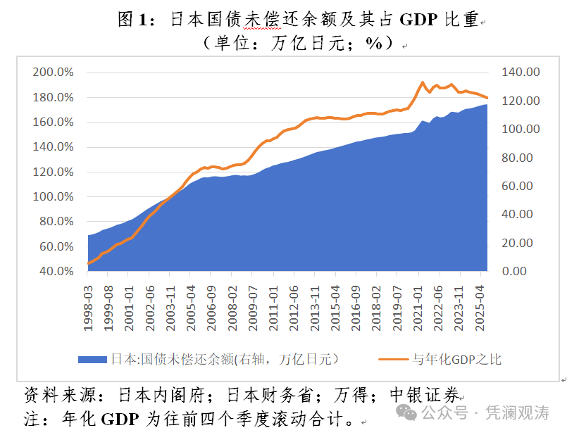 日本政府债台高企与日本经济“失去的三十年”密切相关。上世纪九十年代资产泡沫破裂,将日本推入资产负债表衰退。在非金融企业和家庭部门大幅去杠杆的背景下,日本政府不得不通过财政扩张来应对经济下行。在持续的财政刺激下,日本国债余额与年化国内生产总值(GDP)之比节节攀升,高至190.5%,到2025年9月末仍有179.5%(见图1)。国际货币基金组织(IMF)数据显示,2024年底日本政府债务与GDP之比为237%,系全球发达经济体中最高。