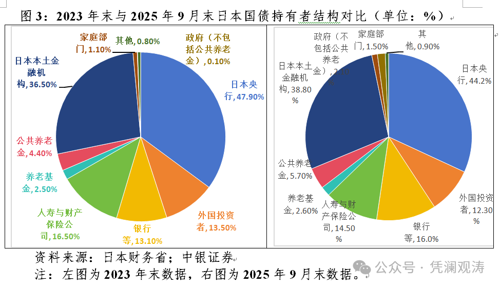 根据日本财务省披露的数据,截至2025年9月末,外国投资者持有日本T-BILLS余额76.5万亿日元,约占日本T-BILLS存量规模的54.4%;持有日本JGB余额69万亿日元,约占日本JGB存量规模的6.6%。从全口径日债看,外资持债占比与日本央行退出YCC高度同步,从2024年3月末的13.0%一路降至2024年末的11.3%。2025年以来其持债规模虽有所回升,但集中在T-BILLS(新增1.2万亿日元),JGB持债规模较平稳(新增0.1万亿日元)。2023年末至2025年9月末,日本央行、外国投资者、人寿保险公司持有日债占比分别回落3.7、1.2和2.0个百分点,银行、养老基金及公共养老金、政府(不包括公共养老金)分别上升2.9、1.4和2.0个百分点(见图3)。需求不足导致市场缺乏流动性,小额抛售便足以引发大震动。根据日本债券交易公司数据,1月20日超长期国债交易金额仅有2.8亿美元。