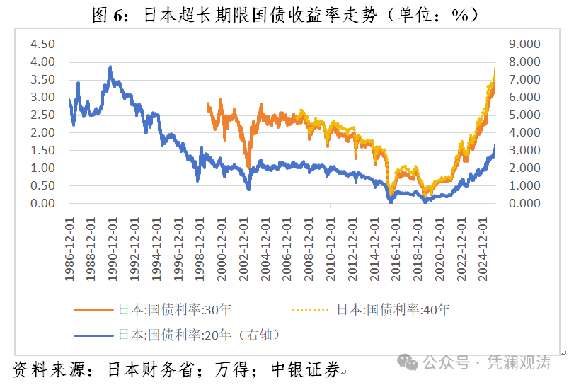 日债收益率持续上升或加剧全球债市波动。在日元低利率时代,通过借入日元、投向美债等高收益资产,可获取稳定的套息收益。但如果日债收益率持续上升,或加大套息交易逆转风险,进而引发更广范围的全球资产抛售。融资端,套息交易以短期利率拆入低息日元,再兑换成高息货币,投资于该货币计价的资产。若后续日央行加息幅度抬升融资成本,将压缩套息交易的收益空间,引发交易反转。投资端,若日债收益率持续上升,原有的高息资产吸引力下降,也会推动套息交易的反转。2024年7月底日本央行超预期加息叠加美国就业数据意外走弱,引发8月5日全球股市剧震就殷鉴不远。而2026年1月20日,在日本国债市场震动的同时,美国、欧洲以及亚洲等新兴市场债市也均遭遇不同程度的抛压。虽然背后驱动因素并非全然由日债波动导致(如美债波动更多缘于地缘政治风险事件的影响和美债避险资产地位的削弱),但作为低利率时代的全球廉价资金主要来源,日债波动的外溢影响仍需密切关注。截至2026年1月29日,40年期日债收益率收在3.66%,较1月20日回落24个基点,20年和30年期日债收益率也分别回落了15和20个基点,反映市场情绪有所缓和,但收益率仍处于相对高位(见图6)。往后看,如果市场对日本财政风险的担忧重燃,不排除日债收益率再度上行。